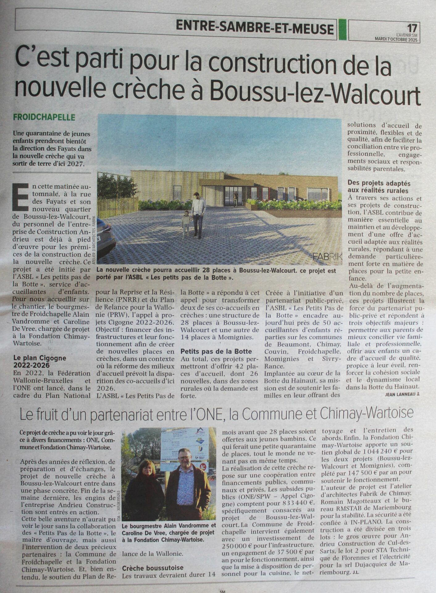 La construction de la nouvelle crèche de Boussu-lez-Walcourt est officiellement lancée dans le quartier des Fayats. Ce projet, porté par l’ASBL Les Petits pas de la Botte, offrira 28 places d’accueil supplémentaires pour les jeunes enfants dès juillet 2027.